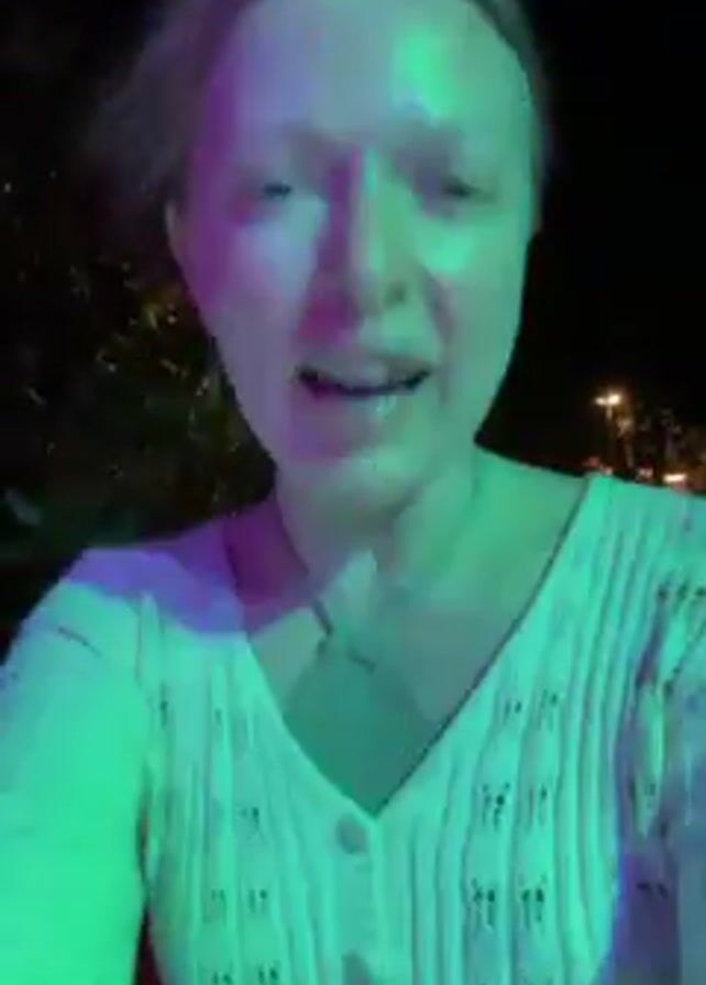 A young woman with fair hair is recording a video of herself. She is wearing a white, long-sleeved shirt with a V-neck. The video is lit by colored lights, alternating between blue, red, purple, and green. The background is dark with hints of foliage and a street lamp. The woman is looking at the camera and talking. The lighting is constantly changing, altering her appearance.