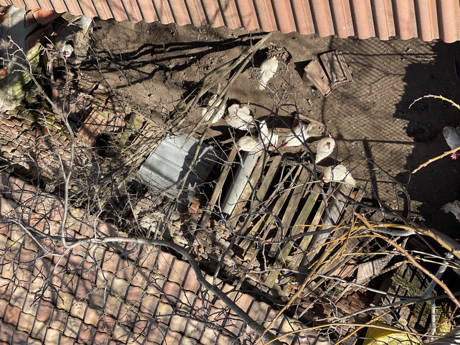 The image presents a high-angle view of an urban backyard enclosure within Sofia, Bulgaria. The primary ground surface is bare, dark soil, illuminated by direct sunlight which casts sharp, intricate shadows from numerous overhead bare tree branches and twigs. Approximately ten white domestic chickens are dispersed across the dirt, appearing to forage or rest. Architectural elements include a section of terracotta-tiled roof visible along the upper-left and central-left edge, and a vertical strip of similar terracotta roof tiles running along the right edge of the frame. In the central-left, a rudimentary wooden structure composed of horizontal planks, possibly a collapsed fence or part of an animal enclosure, is present amidst some debris. Further back, towards the top-center, an accumulation of rubble, broken bricks, and a grey, trough-like object are visible. A small stack of three terracotta tiles rests on the dirt ground in the mid-right section. No human subjects or explicit interactions are depicted.