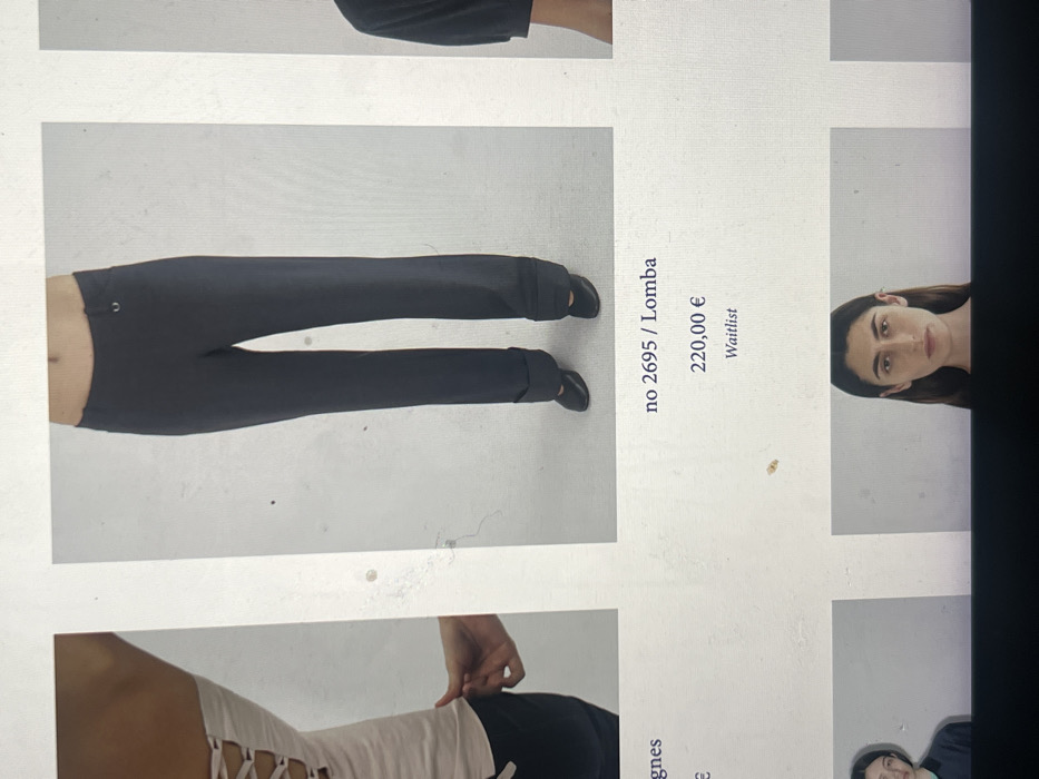 The image displays an electronic screen, likely a computer monitor or tablet, featuring a multi-panel layout of what appears to be an online fashion catalog. The location in the city of Paris, France, is not discernible from the provided image. The central and most prominent panel showcases a pair of dark gray or black straight-leg trousers with cuffed ankles, worn by an individual whose torso and head are out of frame. The wearer's feet are clad in black flat shoes. A metallic ring-shaped detail is visible on the left side of the trouser waistband. Below this image, overlaid text identifies the item as "no 2695 / Lomba," priced at "220,00 €," and indicates a "Waitlist" status. To the left of the central panel, a partial view shows the back of a person wearing a light-colored, possibly off-white, strapless top with criss-cross lacing down the spine. A hand is visible near the bottom left of the top, appearing to adjust the garment. Partial views of individuals are present in other panels: - Top-right: A fragment of a dark-colored top on a person. - Bottom-left: Head and shoulders of a person with short dark hair, facing slightly away. - Bottom-center: Head and shoulders of a person with long dark hair, facing directly forward with a neutral expression. - Bottom-right: The top of a person's head is visible. All featured individuals and garments are presented against plain, light-colored backgrounds, typical of studio photography. The screen itself appears clean, though some faint smudges or dust particles are visible on its surface. The overall scene depicts a digital display of clothing items for retail purposes.