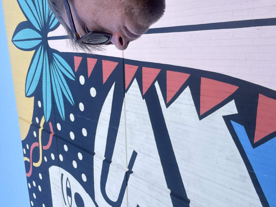 A man wearing sunglasses and a hint of stubble poses in front of a vibrant, modern mural. The artwork features geometric shapes and whimsical designs. Blue leaves accent a yellow background, and a string of colorful squiggles adds a playful touch. Navy paint with white dots meets alternating red triangles. Thick white lines with a black outline resemble sharp mountains, while a blue panel grounds the bottom.