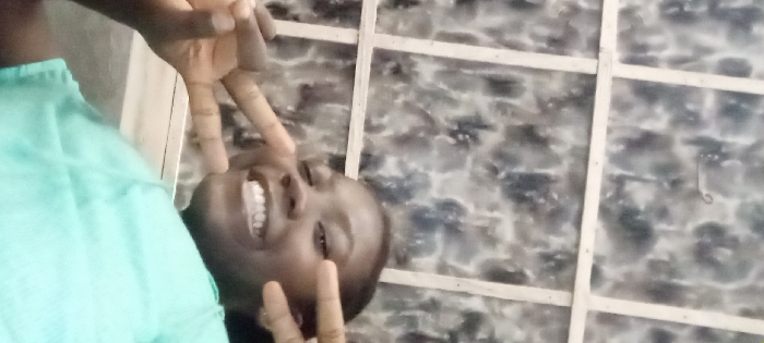 A young person, seen from a sideways angle, smiles broadly with a peace sign displayed on both sides of their head