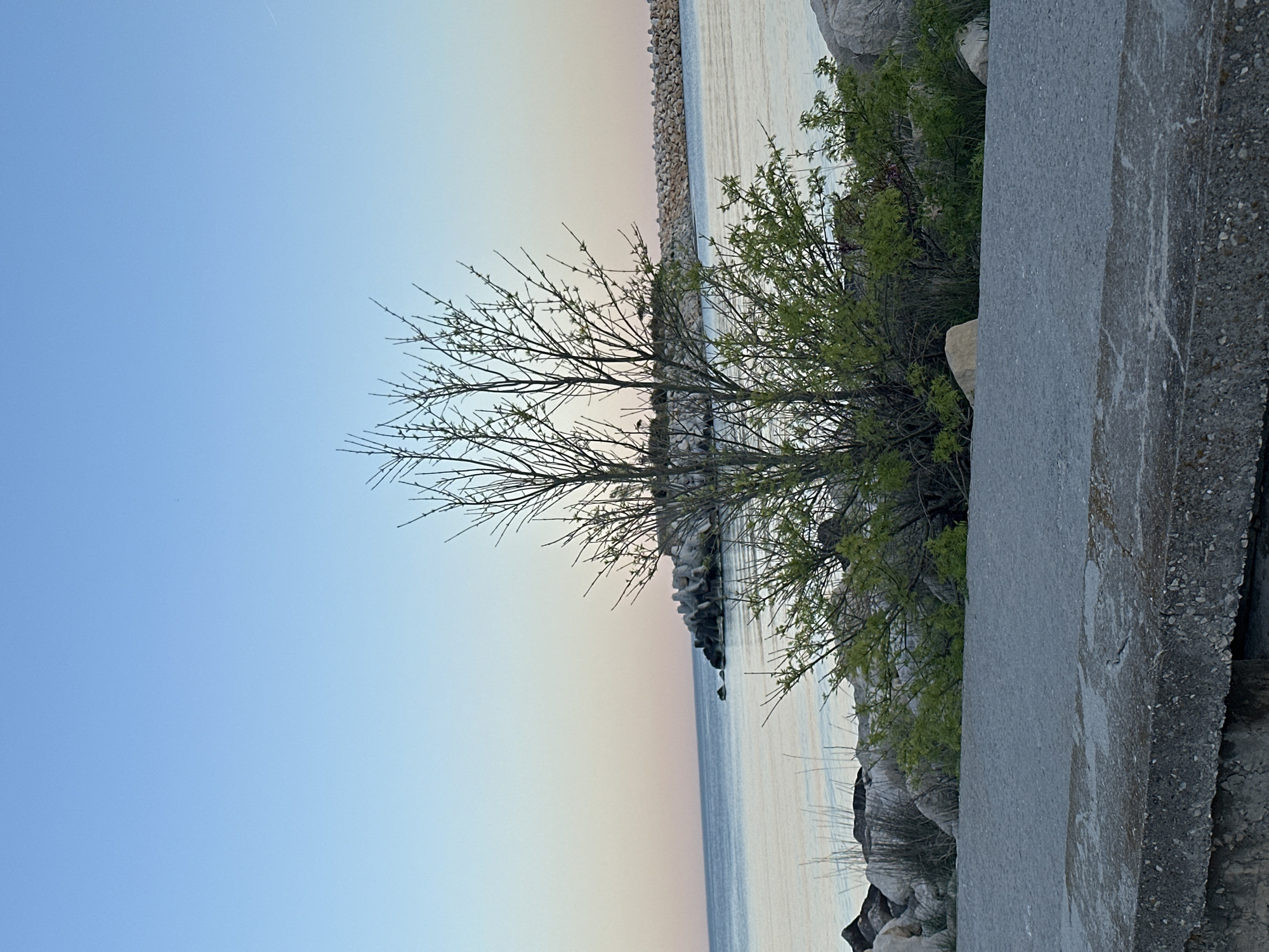 scene near the Black Sea in Varna, Bulgaria. A concrete barrier is on the right side of the frame, with the edge visible. To the left of the barrier, there is a shrub with both green leaves and bare branches. In the background is the Black Sea. A rock barrier is visible in the sea. The sky is light blue near the top of the frame, transitioning to a pale orange and pink hue near the horizon. The water reflects the colors of the sky.