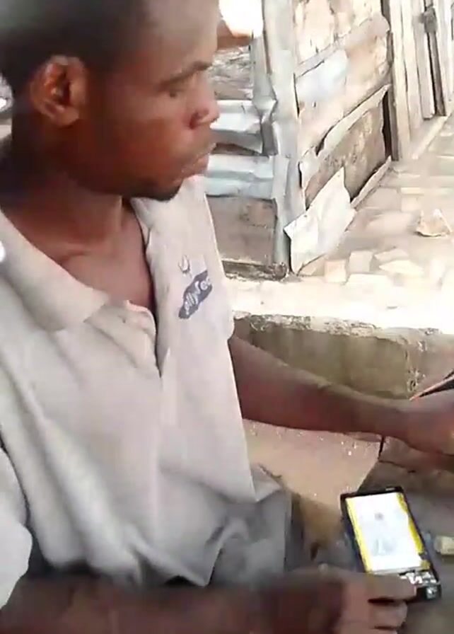 A man is sitting at a wooden table, repairing a cell phone. He is wearing a light grey polo shirt. The table is covered with tools, including screwdrivers, pliers, and electrical wiring. There is also a black power bank sitting on the table. The background of the video is a blurry outdoor scene.