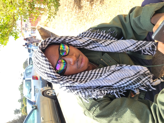 The image captures an individual in Barikin Jirga Summa, Nigeria, presented in a close-up, likely self-portrait
