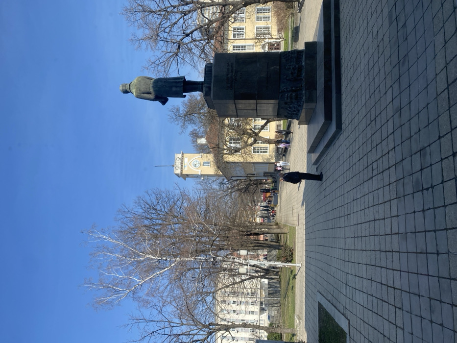 A wide-angle exterior view captures a public square in Gabrovo, Bulgaria, specifically in front of the Gabrovo Municipality Building. In the right foreground, a large bronze statue of a man, identified as Vassil Levski, stands facing away from the viewer, positioned atop a multi-tiered, dark stone pedestal. The man is depicted in a long coat, holding an object resembling a book or scroll in his left hand. The pedestal features visible inscriptions and reliefs. Behind and slightly to the right of the statue is the Gabrovo Municipality Building, a yellow, two-story structure with multiple windows and a prominent, ornate clock tower featuring a white clock face and arched windows. The ground is paved with grey square tiles, forming a wide walkway that extends into the mid-ground and background. Grassy areas flank the walkway, interspersed with numerous bare deciduous trees, including a prominent birch tree with white bark on the left. Further left, a multi-story, light-colored residential or office building is partially visible. In the mid-ground, to the left of the statue, a lone male individual dressed in a dark suit stands facing towards the left, with his back partially to the camera. Further down the central walkway, a group of approximately 10-15 individuals are visible, walking or standing casually. White, multi-lamp streetlights are positioned along the left side of the walkway. The scene is illuminated by bright sunlight under a clear, cloudless blue sky, casting distinct shadows across the paved areas.