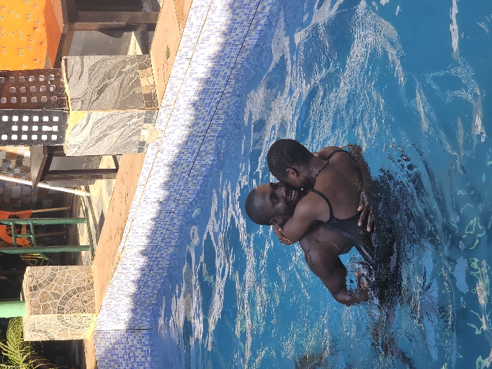 The image captures two adults, a male and a female, embracing in a swimming pool in Asaba, Nigeria