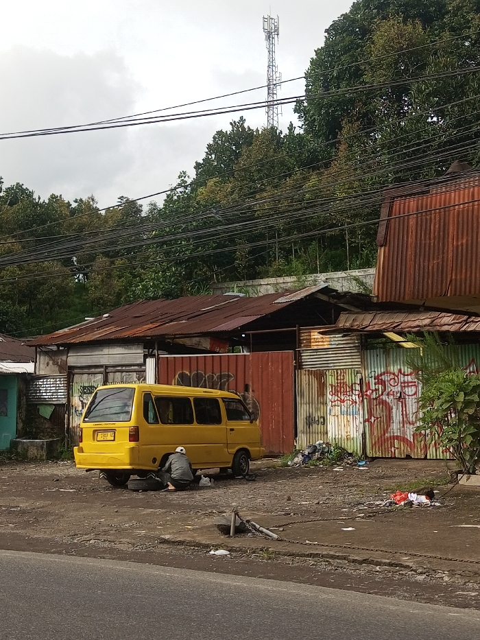 A yellow van is parked on a dirt lot with a man working on a tire. Behind the van are various buildings with corrugated metal walls, some covered in graffiti. A rusty metal roof covers one building. Trash and debris are scattered around the lot. Overhead electrical wires crisscross the sky, and a tall cell tower stands in the background, surrounded by trees. The scene appears to be in a developing area.