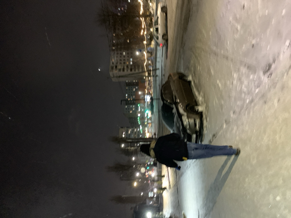 A nighttime street scene shows a person walking on a snow-covered sidewalk. Buildings with illuminated windows line the street. Cars are parked along the road, which is also covered in snow and shows tire tracks. The sky is dark with a faint crescent moon visible. Streetlights cast a bright glow on the scene.