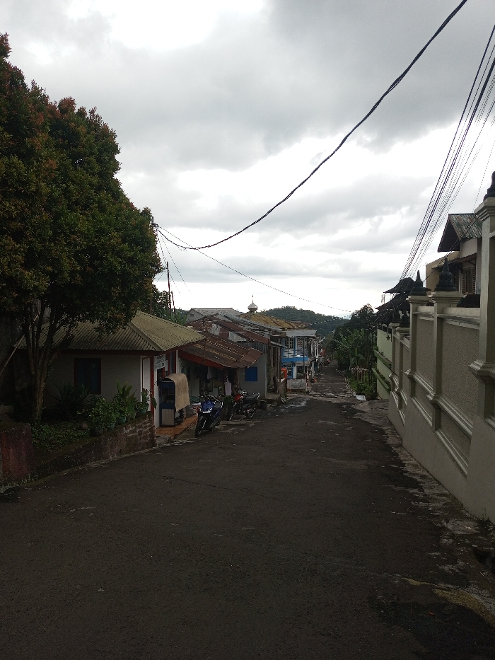 A narrow paved road ascends through a modest village under a cloudy sky. Buildings of varied construction line the street, including small shops and residences. A tree with reddish leaves stands to the left, and a decorative wall borders the right. Two motorcycles are parked near a shop. Electrical wires crisscross overhead, adding to the scene's lived-in atmosphere. A distant hill is visible at the street's end.