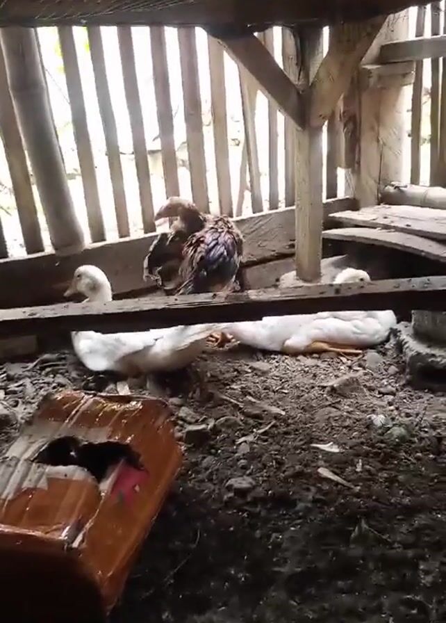 low-angle view inside a wooden chicken coop or similar enclosure. Inside, several white ducks are visible lying on the ground, along with one chicken that has brown and black feathers. The ground is muddy and littered with debris. There's a damaged, brown cardboard box on the ground in the foreground. The enclosure is made of wood, with a slatted wall visible in the background and a wire mesh ceiling. The light seems to be coming from outside the enclosure.