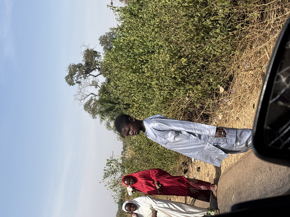The image depicts a roadside scene in Nandu, Nigeria, during daylight hours under a clear blue sky. In the foreground, viewed from a low angle, a cracked vehicle side mirror is partially visible in the lower right. The central subject is a young male, likely a pre-teen, standing in profile facing left. He wears a light grey or silver long-sleeved tunic and matching trousers, with a ring on his right ring finger. He stands on the dirt shoulder adjacent to a dark paved road. To the left and slightly behind him, two adult females are positioned on the road's edge. The leftmost woman wears a white robe and white head covering. The woman next to her wears a red robe and red head covering, and holds multiple white, cylindrical objects in her right hand, resting near her chest. Both women appear to be barefoot. The background features dense green foliage and scrub immediately behind the individuals, extending into the mid-ground on the right. Further back, taller trees, some with sparse foliage, are visible against the sky, along with a palm tree on the far left. The ground on the roadside not covered by lush vegetation consists of dry, light brown soil and sparse dead grass.