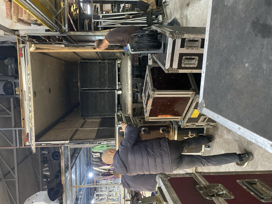 An opened truck reveals stacked sound equipment cases and black speaker arrays inside. Two men appear to be loading or unloading the cases. One man is bent over near the front of the truck, while the other is near the back. The floor around the truck is cluttered with more cases and various equipment. Overhead, exposed structural supports and hanging lights are visible.