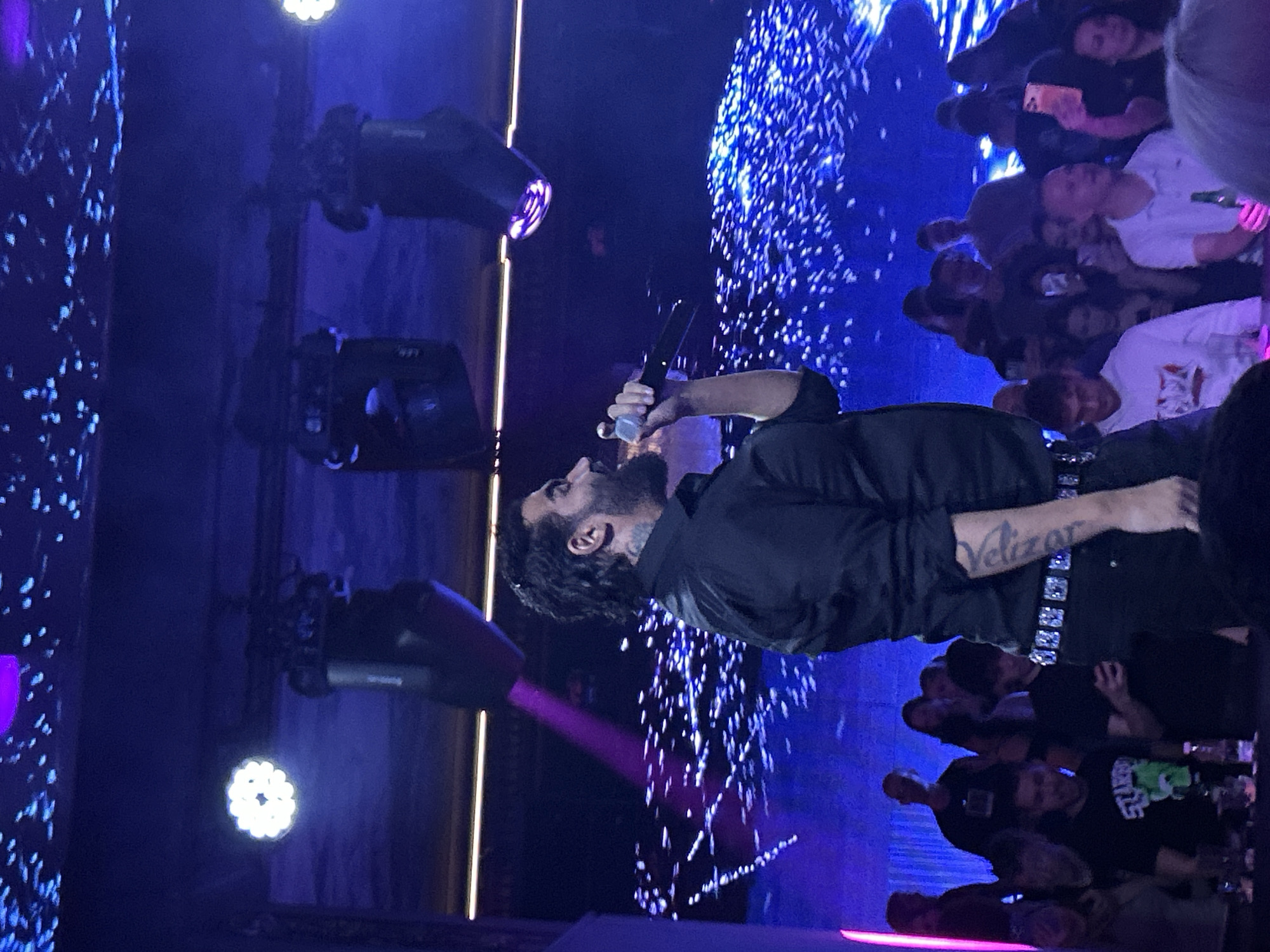 A live musical performance is depicted inside an indoor venue in Sofia, Bulgaria, consistent with a nightclub or concert hall. The central subject is a male vocalist, shown from the chest up, facing right and slightly upward, actively singing into a black microphone held in his right hand. He possesses dark, curly hair and a beard, and wears a black long-sleeved shirt, dark trousers, and a prominent studded or jeweled belt. A tattoo is visible on his left forearm, partially obscured, appearing to spell "Velizar." The environment is illuminated by dynamic stage lighting, predominantly in shades of blue and purple. Overhead, multiple professional moving head stage lights are visible, some emitting bright white light and others casting purple beams. The ceiling or upper wall area features a pattern of numerous small, shimmering blue lights. Below and behind the performer, a crowd of individuals is visible, many of whom are holding up smartphones, indicating they are recording or photographing the event. Visible items within the crowd include beverages, such as a green bottle held by an individual in the lower right foreground. The overall scene captures an engaging musical event.