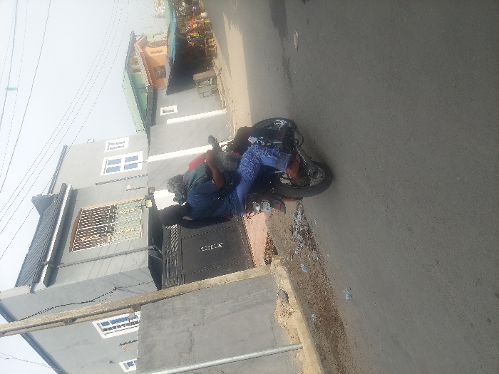 Two people on a motorcycle are parked on the side of a paved road. The motorcycle is black and has a single headlight. The person in front is wearing a red shirt, and the person in the back is wearing blue pants. In the background is a tall, gray, multi-story building with a black gate. Another building is visible behind the first, partially obscured by a tree.