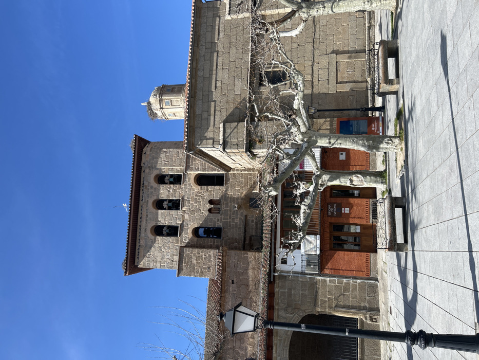 The image displays a clear daytime scene of a public plaza bordering a historic stone building complex in Piedrahíta, Spain