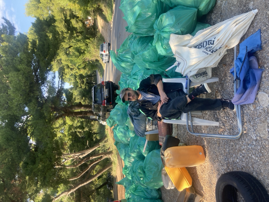 An outdoor scene depicts a man seated on a white plastic chair amidst extensive piles of collected refuse, located on a gravel shoulder next to a paved road in the city of Unknown, Unknown