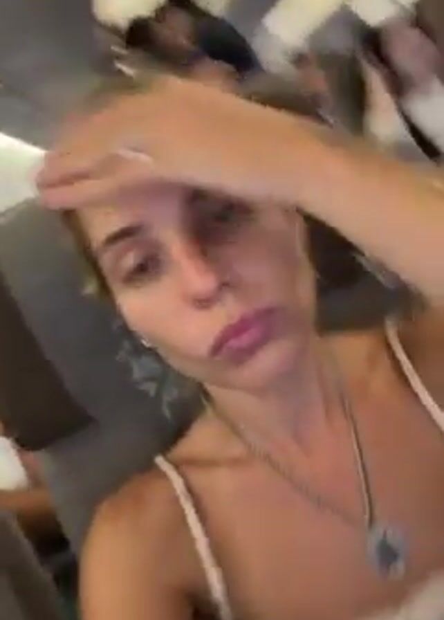 A woman with blonde hair is seated on an airplane in a window seat. She is wearing a white tank top and a silver necklace. She is making a funny face, turning her head, and moving her hair around for the camera. Other passengers are seen in the background.