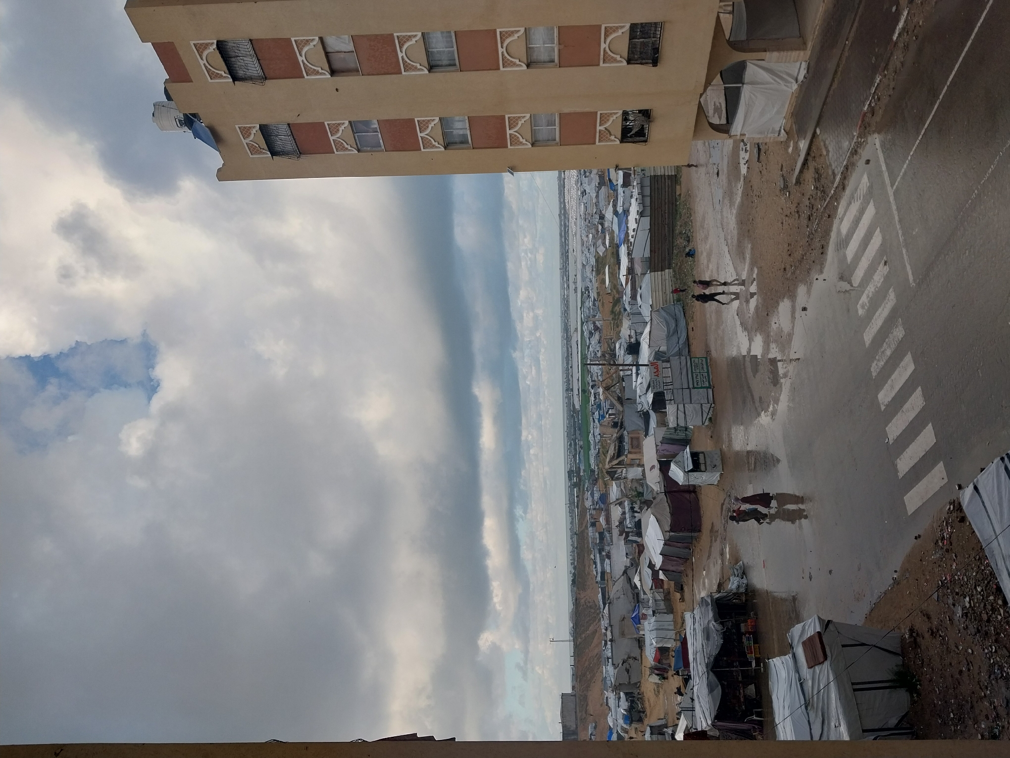 This image depicts a wide view of an informal settlement or refugee camp in Khan Yunis, Palestinian Territory, under an overcast sky with dense grey and white clouds. The scene is observed from an elevated position, likely from a building. In the immediate right foreground, a multi-story, light brown building with reddish-brown accent panels and white ornate window frames is partially visible. The building's roof features a white water tank and a blue solar panel. Several windows appear damaged or partially boarded. The ground level of this building has arched openings, some covered with white tarpaulins. A wet asphalt road with a prominent white pedestrian crossing (zebra stripes) occupies the lower-center of the frame, indicating recent rain. Surrounding the road are muddy, unpaved areas with scattered debris. In the mid-ground, an expansive, densely packed informal settlement stretches across the landscape towards the horizon. It consists of numerous makeshift shelters and tents constructed from white, grey, and blue tarpaulins and various scavenged materials. Visible within the camp are small, more structured stalls, one of which appears to be a market stall with items displayed and signage, including Arabic text and "PAY PAL LTD." Several individuals are present on the wet ground: two adults walk together on the left side of the road, moving away from the viewer, while another pair of adults walks further right, also moving away. Other indistinct figures are visible deeper within the camp. In the distant background, beyond a raised earth barrier or mound, a large body of water, likely the Mediterranean Sea, is visible under the cloudy horizon. The overall environment suggests a densely populated area with basic infrastructure, affected by recent precipitation.