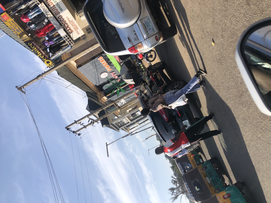 This image depicts a bustling street scene in Kabong, Nigeria, during daytime with long shadows suggesting a low sun angle