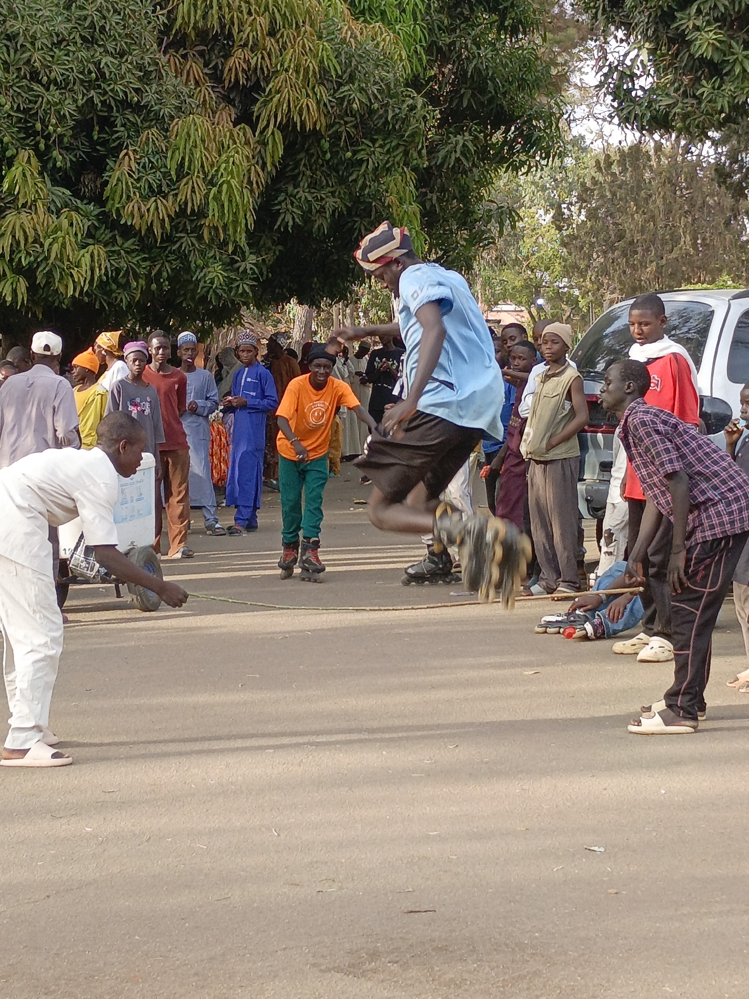 The image depicts an outdoor scene on an unpaved, light brown road or compacted earth path in an unidentified city and country, here referred to as Unknown, Unknown. Approximately 15-20 individuals, predominantly males ranging from children to young adults, are present. In the mid-ground, a male performer wearing a light blue short-sleeved shirt, dark shorts, a striped headwrap, and dark rollerblades is captured mid-air during a jump, with both feet off the ground. A multi-colored cylindrical object with dark tassels or fringe is visibly attached to his right leg, appearing to spin. To his left, another male dressed in white long-sleeved traditional attire and light-colored slip-on sandals is bent forward, holding a thin, light-colored rope or stick that extends to the ground. Behind this individual, a white cooler or small cart is partially visible. To the right of the jumping performer, a male in an orange short-sleeved t-shirt with a smiley face graphic, green trousers, and dark rollerblades stands, observing the action. Further right, a male in a red, black, and white plaid shirt is bent at the waist, looking towards the ground, while another individual sits on the ground behind him, with a pair of rollerblades positioned nearby. The background features numerous spectators, varying in attire from traditional tunics (e.g., blue, grey, maroon) to modern t-shirts and trousers. Many wear head coverings. Behind the spectators on the right, a white SUV or truck is parked. The entire scene is set under bright daylight, indicated by visible shadows on the ground and lush green foliage from large trees, some bearing small green fruits, forming a dense canopy in the background and overhead.
