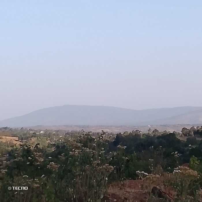 Hazy vista reveals a landscape of rolling hills and scattered vegetation. A distant mountain range, pale and indistinct, sits beneath a muted sky. The foreground is dominated by dense clusters of green foliage interspersed with patches of dry earth. Small white blooms dot the verdant scenery, adding subtle detail. The image suggests a warm, rural setting, captured on a clear yet somewhat obscured day. A watermark in the corner indicates the device of origin.