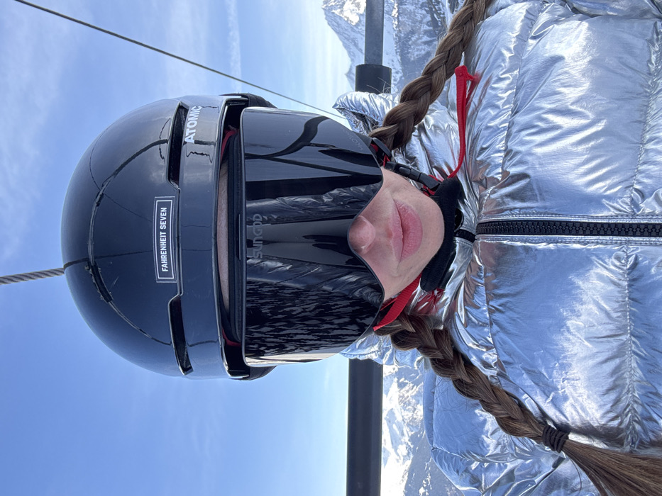 A close-up photograph captures an individual in ski attire on a clear, sunny day in Courchevel, France. The person wears a black ski helmet with "FAHRENHEIT SEVEN" and "ATOMIC" branding, paired with large, mirrored "SUNGOD" ski goggles that obscure the upper face. The visible lower face shows slightly parted pink lips and a chin. The individual is dressed in a metallic silver puffer ski jacket with a black central zipper. Long, brown braided hair with a dark elastic band extends over the shoulders. A red strap is visible around the neck. The background displays a clear blue sky above snow-covered mountains, with elements of a ski lift cable and a horizontal safety bar partially visible.