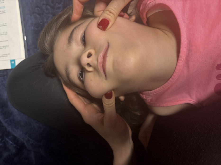 A young girl with light skin and brown hair reclines, her head supported by dark clothing and resting against a dark blue textured surface. She wears a light pink t-shirt. An adult's hands, with red polished nails, gently cradle her face. One hand is positioned on her forehead while the other supports her chin. A book with visible page numbers rests near her head. The girl's eyes are partially closed, and she has a small mole on her cheek.