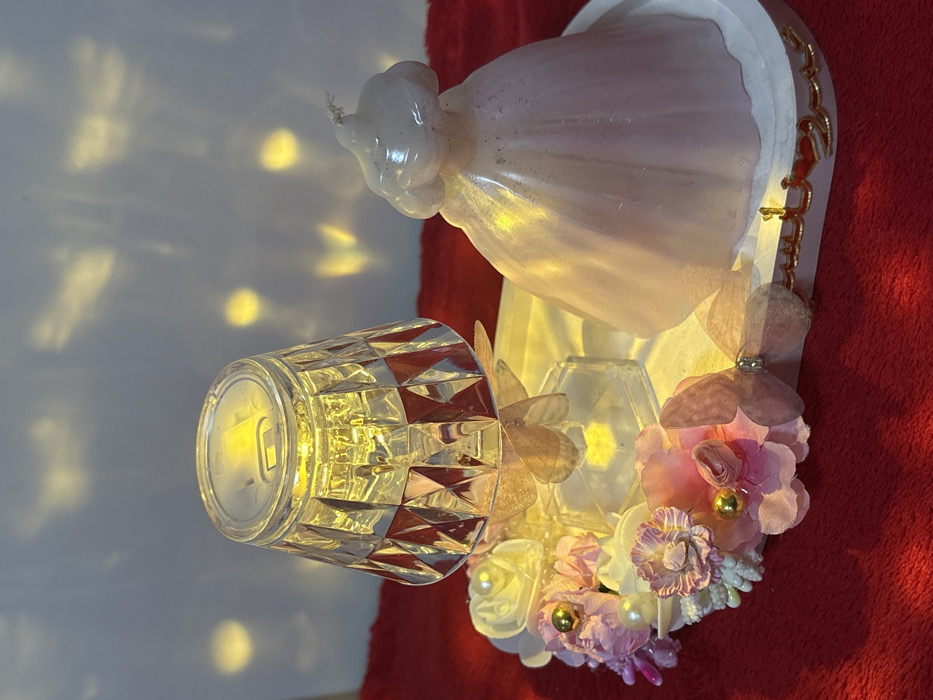 A softly lit, multifaceted glass container rests next to a decorative arrangement. The arrangement includes pale pink and white flowers, sheer ribbon embellishments, and a candle shaped like a figure, possibly an angel or a bride. This rests on a white, slightly curved base with golden accents, all positioned on a red surface. The lighting gives off a warm glow, highlighting the textures and delicate details of the display.
