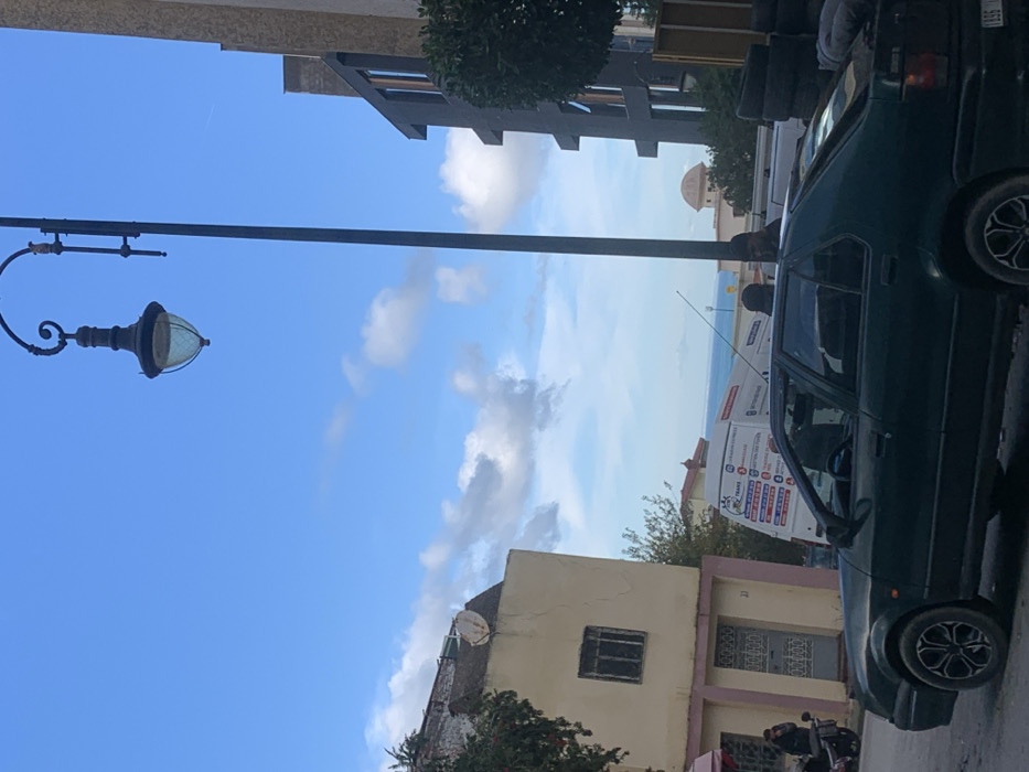 A green car is parked on the right side of the frame. To the left, a black lamppost with a curved arm and glass globe stands tall. A tan building with a small, dark window is near the car. In the background, a glimpse of the sea can be seen under a partly cloudy sky. A building with a dome is visible in the distance. Other buildings and vegetation are scattered throughout the scene.