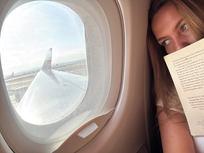 The image depicts an interior view from an airplane cabin, specifically at Palma de Mallorca Airport (PMI) in Spain. On the right side of the frame, a female subject with long, light brown hair is partially visible. Her eyes are directed towards the left, appearing to look out of the aircraft window. Her lower face is obscured by an open paperback book she is holding. Visible text on the book identifies the work as "The Picture of Dorian Gray" by "Oscar Wilde." The airplane's interior wall is a light, neutral color. Through the rounded, dust-speckled aircraft window, a section of the plane's white wing, featuring a prominent red-tipped winglet, is visible in the foreground. Beyond the wing, an airport runway or tarmac is discernible. In the mid-ground, the vertical stabilizer of another aircraft can be seen. The background features low, distant hills or mountains under a bright, light blue sky with minimal cloud cover, consistent with the geography surrounding Palma de Mallorca. The aircraft appears to be stationary or moving slowly on the ground.