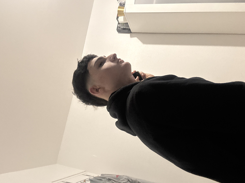 A young male individual is depicted indoors in Ostwald, France. He is shown in profile, facing right, wearing a black hooded sweatshirt. His hair is dark, styled with a faded cut on the sides and longer, curly hair on top and at the back. He holds a small, dark rectangular object to his mouth or chin area with his right hand. The background consists of plain white walls. To the far left, a clothing rack with light-colored garments is partially visible. To the right, a white cabinet with reflective panels or glass doors is present, topped with several books and a small golden decorative object.