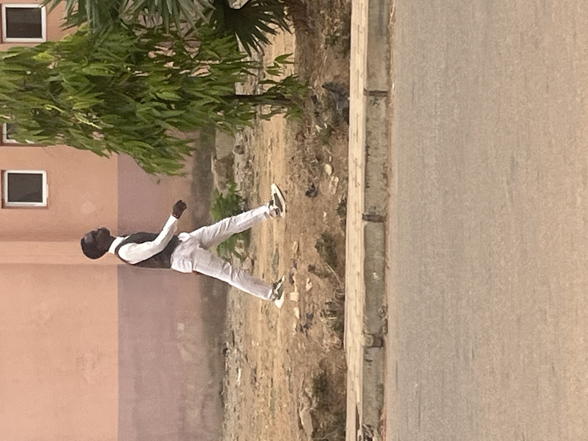 A person wearing a black vest over a white shirt and white trousers stands in an unpaved area adjacent to a building and a street in Badiko, Nigeria
