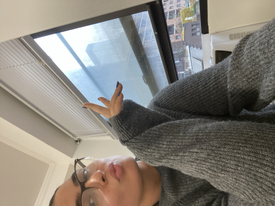 A person with glasses and wearing a gray sweater leans into the frame, pouting slightly. The photo is taken from a low angle, looking up. Behind the person is a window with blinds partly open, showing a cityscape outside. The person's hand is raised near the window. The scene suggests an indoor setting, likely an apartment with a view of the city.