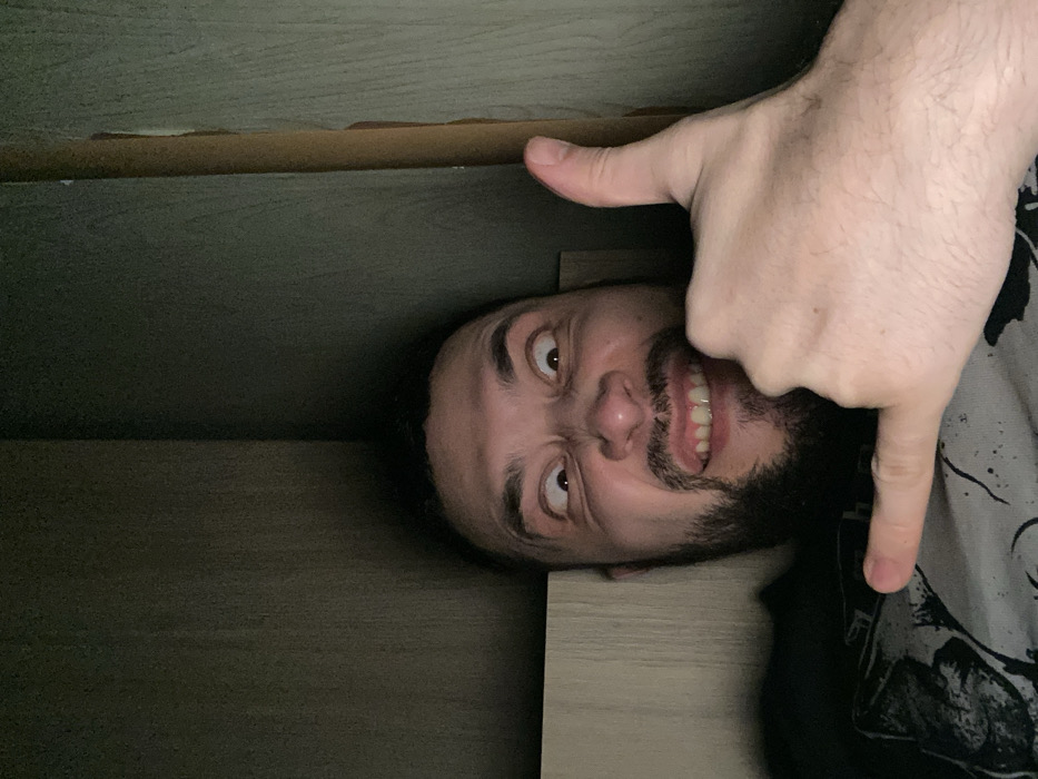 A bearded man's face is angled to the side and crammed into a wooden space. His eyes are wide, and he's grinning with visible teeth. His large hand is positioned above him with the thumb up and the index finger pointing down towards his face. He wears a t-shirt with a white and black pattern. The wood enclosure appears to be inside a closet or shelf, and the lighting is dim.