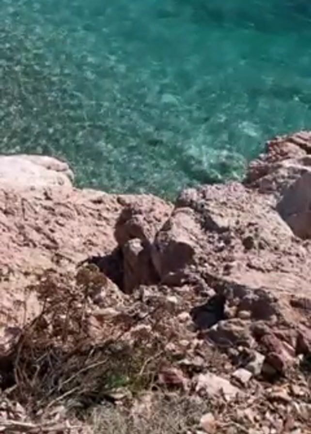 rocky shore overlooking clear turquoise water. The rocks are mostly reddish-brown and form a small cliff above the water line. There is some sparse vegetation near the edge. The water is calm with small ripples on the surface and the bottom is visible through the clear water.