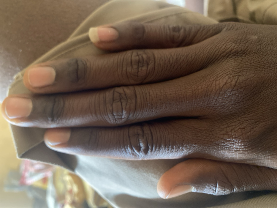 A dark-skinned hand rests on tan fabric. The hand is folded with the fingers overlapping. The fingernails are short and have a natural appearance. The skin shows visible creases and textures. The fabric appears to be clothing, possibly a shirt or pants. The background is slightly blurred and indistinct. The lighting accentuates the details of the skin and fabric.