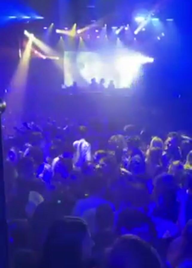 A dense crowd of people fills a darkened indoor space, illuminated by bright blue and white stage lighting. A band or DJ performs on a stage at the far end of the room, their silhouettes visible against a backdrop screen. The camera moves through the crowd, with some people visible only as heads and shoulders, while others appear more clearly as the camera passes close. The atmosphere is vibrant and energetic, suggestive of a concert or club setting.
