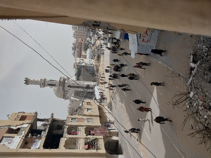 The image depicts a wide street in Khan Yunis, Palestinian Territory, characterized by extensive urban destruction under an overcast sky. In the foreground on the left, a multi-story building exhibits severe structural damage, with exposed rebar, shattered facades, and internal sections visible. On the right, a partial view of a building's interior wall frames the scene. The central feature in the background is a visibly damaged mosque with a prominent dome and a tall, partially scarred minaret, standing amidst a field of rubble from surrounding collapsed structures. Further down the street, additional damaged and partially collapsed buildings are present. The main asphalt road, showing faint white markings, is traversed by approximately 50-70 individuals, primarily civilians of various ages. They are walking in both directions, singly and in small groups, on the roadway and along its sandy, debris-strewn edges. Most individuals wear everyday clothing, with some women wearing headscarves. No clear specific interactions are discernible beyond general movement. The ground surface consists of asphalt, packed dirt, and scattered debris including concrete fragments, rebar, and construction remnants. Overhead utility lines span across the street. A makeshift stall covered with a white tarp, featuring red Arabic script, is visible on the right sidewalk. A single car is faintly visible in the distant background.