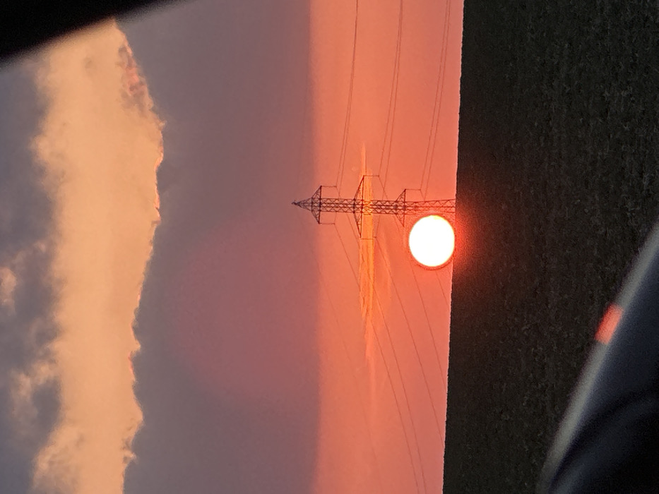 The image displays an outdoor scene at either sunset or sunrise, characterized by a vibrant sky over a rural landscape in Oreshak, Bulgaria. The sky exhibits a gradient of colors, transitioning from orange at the top to deep red and purple towards the horizon. A band of dark, heavy clouds is present in the upper half of the sky. A prominent, circular, intensely bright white-yellow sun is positioned low on the horizon, approximately one-quarter of the way up from the bottom of the image, slightly to the left of the vertical center. Its lower portion is obscured by the dark horizon line. To the right of the sun, a lattice-steel electricity transmission tower, commonly known as a pylon, stands tall, its dark silhouette contrasting against the bright sky. Multiple power lines extend horizontally from the tower's cross-arms across the frame. The foreground consists of a dark, undifferentiated expanse of land, likely a field, forming a flat horizon against the sky. In the extreme bottom left, a dark, curved object, consistent with the interior frame of a vehicle, is visible, partially obscuring the field. A small, faint red light or reflection is present on this object. No individuals are visible in the scene.