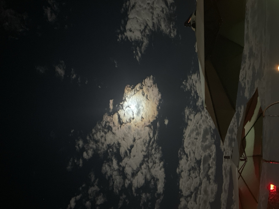 The image depicts an outdoor nighttime scene in Kasar Devi, India. The upper two-thirds of the frame show a dark sky filled with numerous cumuliform clouds, predominantly white and grey. A bright, circular light source, consistent with a moon, is centrally positioned in the upper portion, partially obscured by a prominent cloud formation, which scatters its light. In the lower third, two large, open outdoor umbrellas are visible. The umbrella on the right is dark-colored, possibly olive green or brown, and occupies the lower right quadrant. The umbrella on the left is lighter, exhibiting a reflective surface with white and faint greenish tones, and appears to have a red glow emanating from its underside or nearby, likely from a red lantern or light fixture visible on the far lower left edge. A small, faint orange light source is also discernible on the extreme lower right edge. No individuals, specific actions, or interactions are present in the scene. The environment indicates an outdoor area, possibly a patio or terrace, under natural moonlight and minimal artificial illumination.