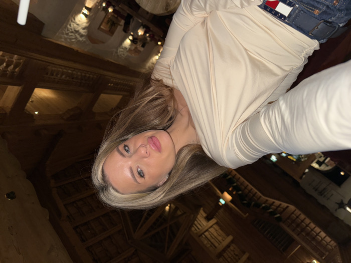 A woman with blonde hair, light skin, and light blue eyes poses indoors. She wears a cream-colored long-sleeve shirt and blue jeans with a Tommy Hilfiger patch. The background features a rustic interior with exposed wooden beams and dim lighting. Tables and chairs are visible in the distance, suggesting a restaurant or lodge setting.
