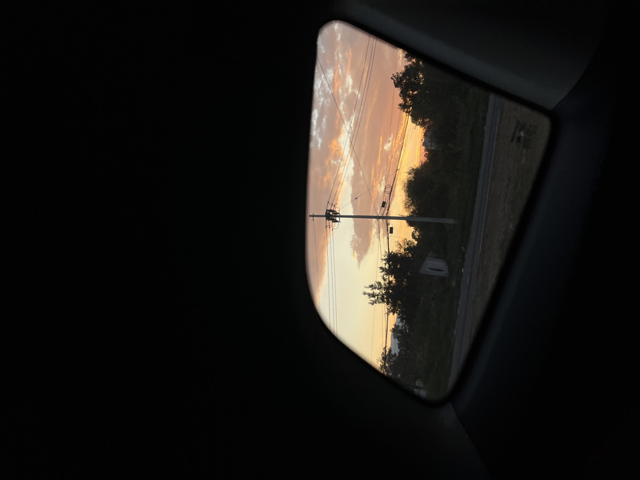 A skewed view of a sunset through a window reveals a landscape. Electric poles and wires cut across the orange and pink sky, bordered by trees and a road. The darkness of the vehicle's interior surrounds the window, creating a stark contrast. A small, weathered structure peeks through the trees, adding to the rural scene captured in the frame.