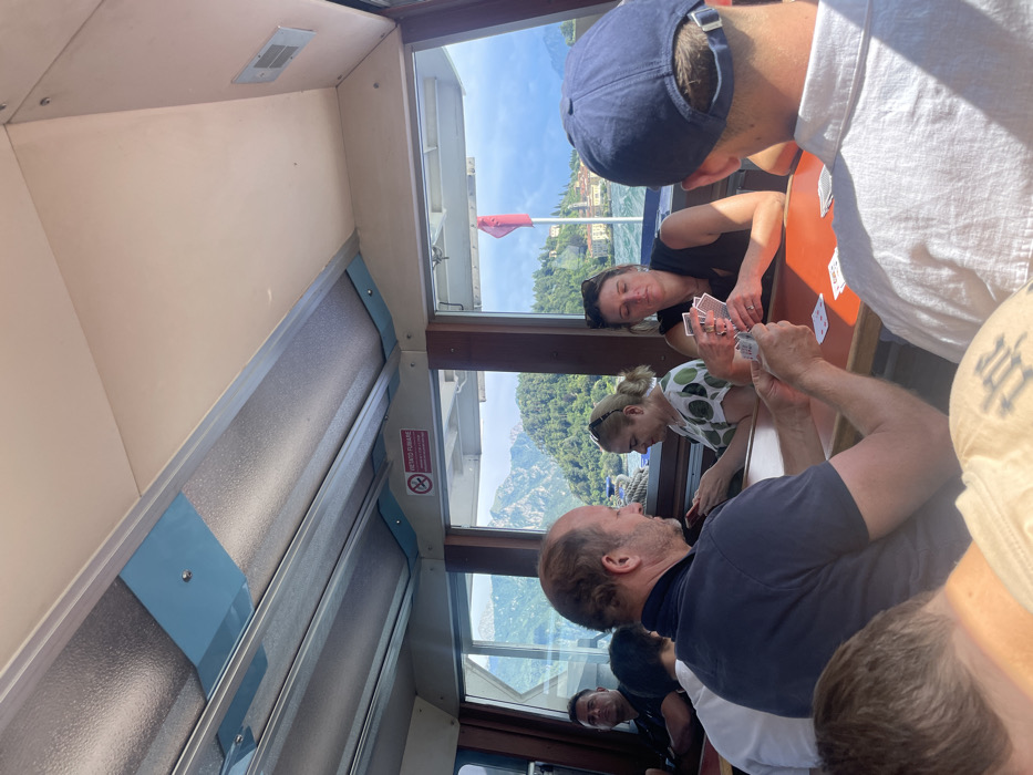 People are playing cards at a table with a view from the window. The outside shows a landscape with water, mountains, and a building with a red flag. There are several other people partially visible around the table. The inside is light with paneled walls and windows with a sign in Italian. The overall image is somewhat tilted.