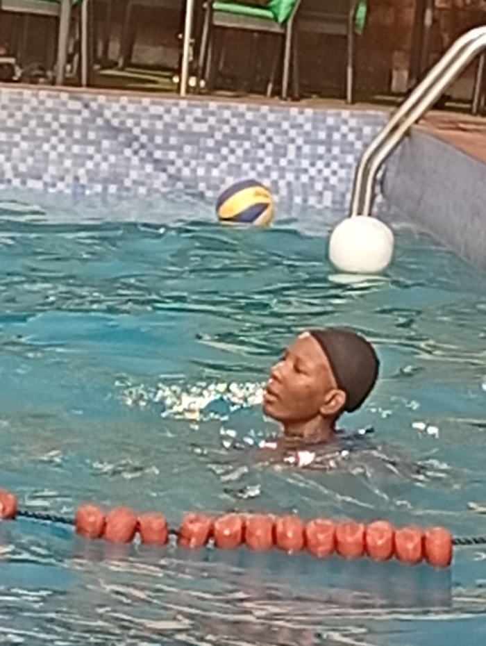 A person with dark hair and a dark swimming cap is in a swimming pool looking to the right. A blue and yellow ball floats in the pool behind them. A white ball is by the side of the pool. The pool is tiled with small, light-colored squares. A safety rope with orange buoys runs across the bottom of the frame. Metal railings and green chairs are visible in the background.