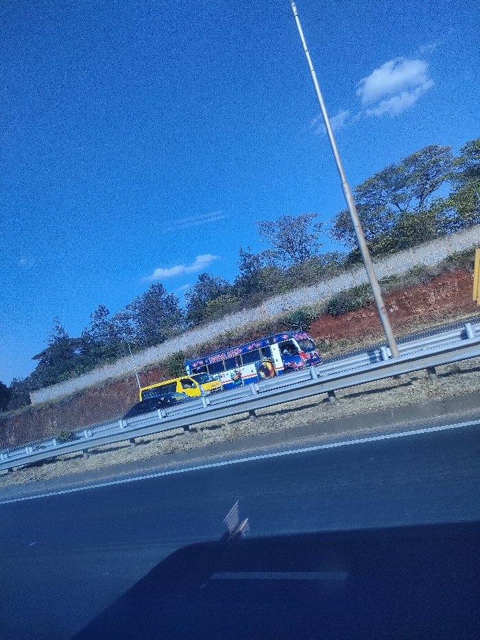 A roadside scene under a bright blue sky. A colorful bus and a yellow vehicle are parked on the shoulder of a highway, separated by a silver guardrail. A grassy slope rises behind the vehicles, topped with trees. A tall, thin, metal pole stands near the edge of the highway. The foreground is dark, suggesting the view is from inside a vehicle.