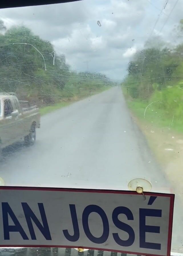 The video, shot from inside a vehicle, shows a road on a cloudy day, likely in a rural area as indicated by the surrounding greenery. Another car is visible in the distance on the road ahead. The vehicle's windshield is partially obstructed by a "San Jose" sign. As the video progresses, the camera moves to show the side view from the vehicle, revealing fields and trees passing by. The video provides a sense of movement and travel.