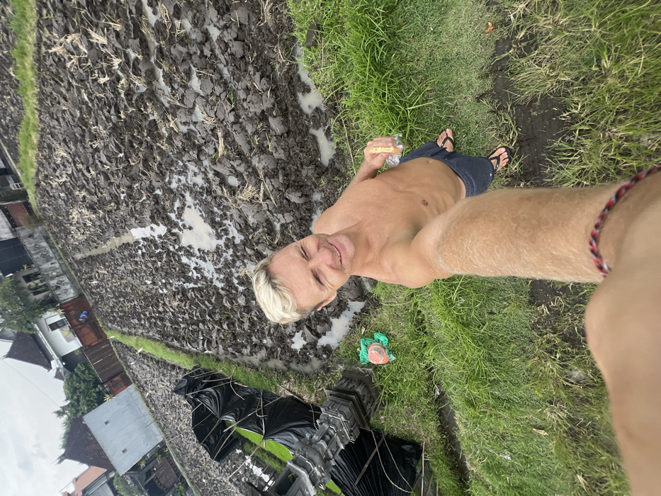 A shirtless, blonde man stands at the edge of a muddy rice field, taking a selfie. He holds a wrapped item in one hand and wears dark-colored shorts and flip-flops. Lush green grass surrounds the field, while structures, likely houses, are visible in the background. A temple or shrine covered in black plastic is situated near the man. He is smiling at the camera.