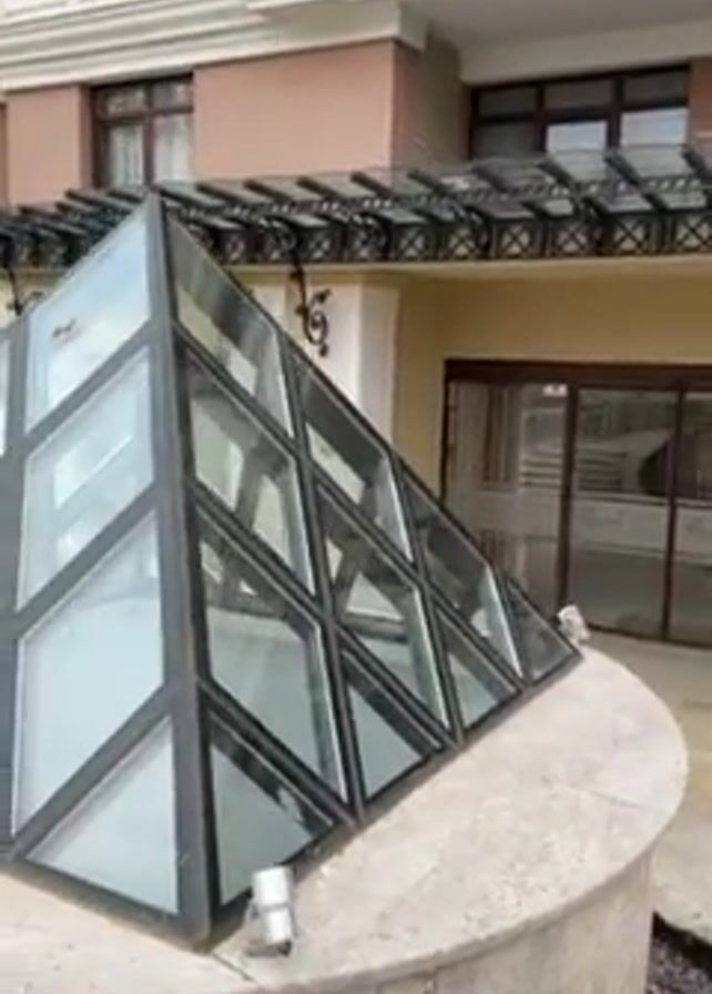 The camera slowly pans around a pyramid-shaped glass structure sitting atop a low, rounded stone wall. Behind the structure, the facade of a building is visible, featuring a mix of light pink and beige colors. Windows with dark frames are spaced across the building, and a decorative awning with wrought-iron details extends over a glass entrance. The ground is paved with light-colored stone tiles.