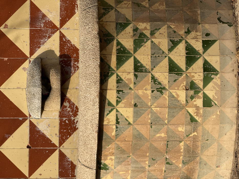 This image captures a weathered public fountain or decorative tiled structure located in L'hospitalet De Llobregat, Spain. The structure is vertically divided into three primary horizontal sections. The uppermost section is a wall clad in square ceramic tiles, each bisected diagonally to form a pattern of alternating yellowish-beige and reddish-brown triangles. Centered within this upper section is a light-beige, textured concrete or stone water spigot, roughly oval-shaped with a rounded top and a dark, recessed opening for water flow, casting a shadow to its right. Below this, a horizontal, textured light-beige concrete band acts as a visual separator. The lowermost section is a curved surface, likely part of a basin, covered in smaller square ceramic tiles. These tiles are diagonally split into yellowish-beige, green, and faded brownish-grey triangles, arranged in a repetitive geometric pattern. The entire structure displays extensive signs of age and deterioration, including chipped and faded tile glaze, discoloration, and general surface wear. The scene is illuminated by direct sunlight from the upper left. No individuals or specific actions are depicted.