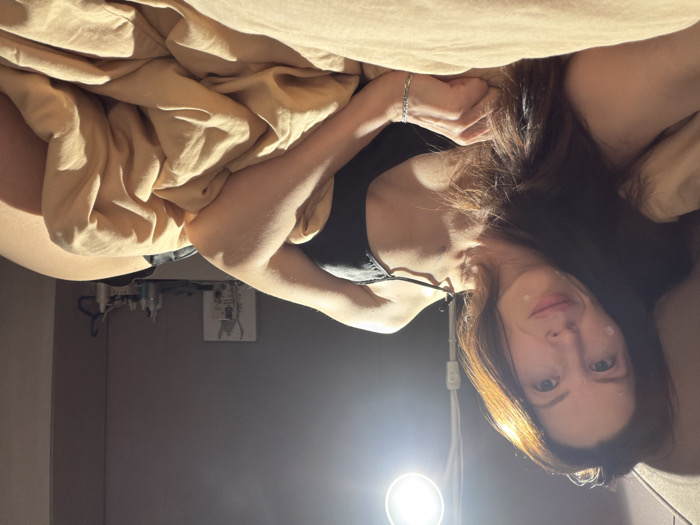 A woman lies in bed under beige sheets, wearing a black top. A bracelet adorns her wrist. Fair skin shows minor blemishes. Her long, dark hair spreads across the pillow. A light source shines from below, casting shadows on the wall. Outlets and medical equipment are visible behind her. The overall impression is one of casual comfort in a bedroom setting.